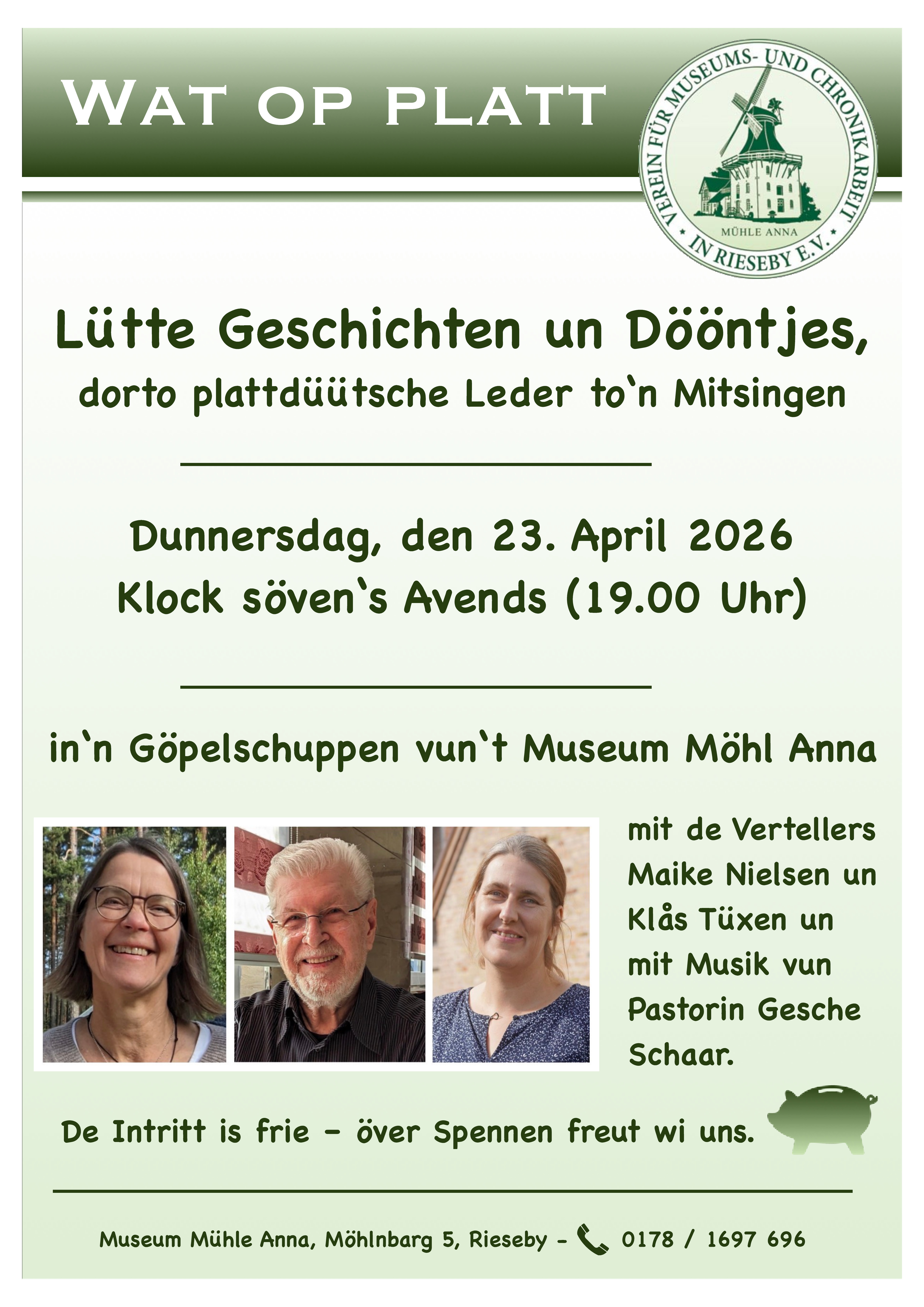 Freuen wir uns auf einen abwechslungsreichen Abend mit kleinen Erzählungen, Anekdoten und Geschichten aus dem Alltag, die zum Schmunzeln, zum Nachdenken und vielleicht auch zum Wiedererkennen einladen. Das Plattdeutsche lebt von seiner Nähe zu den Menschen und ihren Geschichten – genau das macht diesen Abend jedes Jahr zu etwas Besonderem.