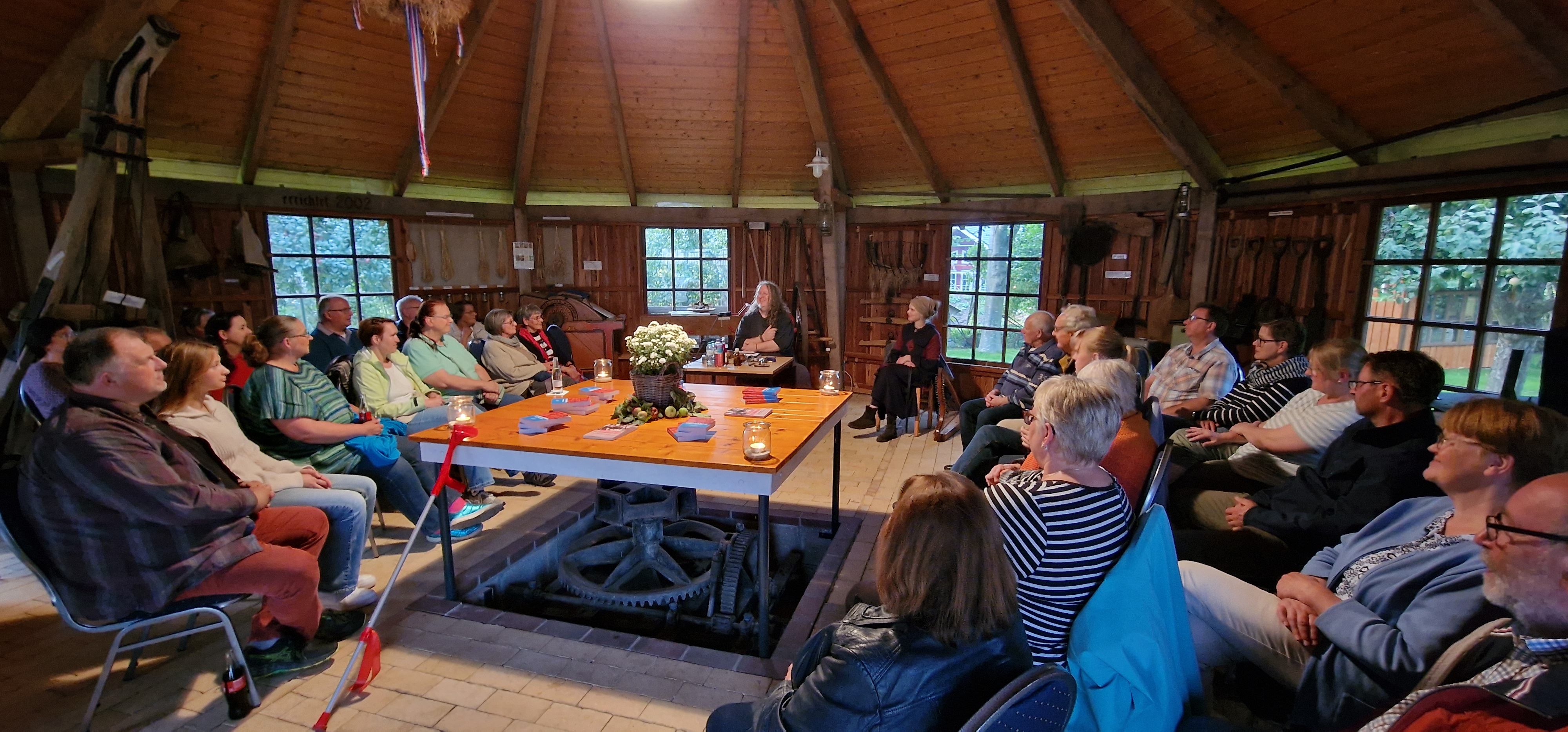 Die Stimmung im Göpelschuppen war bestens: die Ausstellungsstücke im Hintergrund und die klare Akustik des Raumes lieferten eine solide Grundlage, auf der Olaf Wegermann mit seiner direkten und herzlichen Art uns allen einen spannenden und unterhaltsamen Abend bereitete.