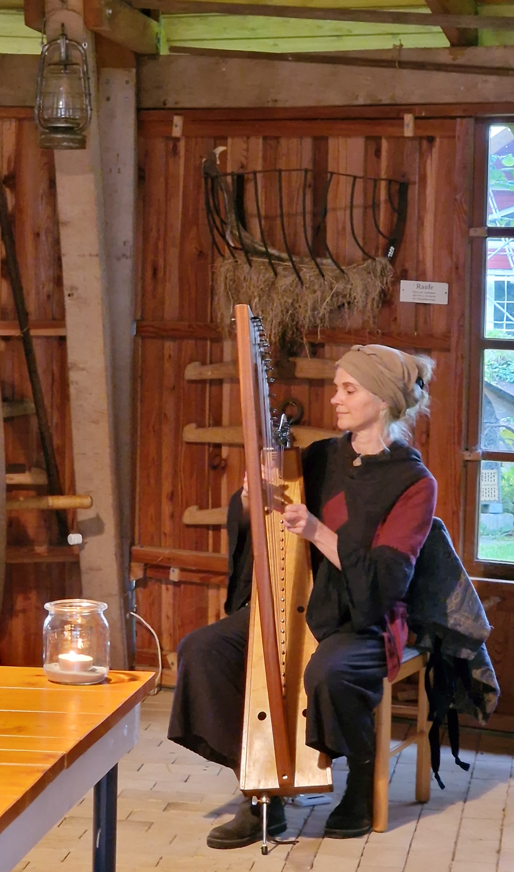Kirsten Freienstein spielte in den kleinen Pausen mit der Harfe stimmungsvolle Melodien und lockerte das ernste Thema der Hexenverfolgungen erfolgreich auf.